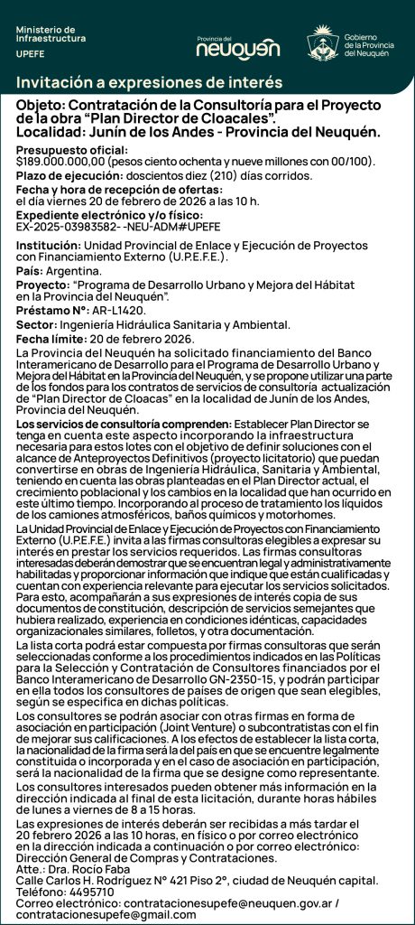 02 Feb 2026Expresiones de Interés, Sin categoría Consultoría para el Proyecto Actualización Plan Director de Cloacas en la Localidad de Junín de los Andes, Provincia del Neuquén.- ACCESO TDR consultoria, Neuquen