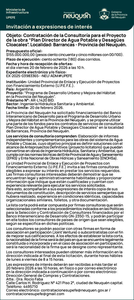 02 Feb 2026Expresiones de Interés, Sin categoría Consultoría para el Proyecto – Plan Director de Agua Potable y Desagües Cloacales en la Localidad de Barrancas, Provincia del Neuquén. ACCESO TDR BID (AR-L1420), consultoria, Neuquen