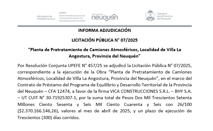 LICITACIÓN PÚBLICA N° 07/2025 – OBRA: “PLANTA DE PRETRATAMIENTO DE CAMIONES ATMOSFÉRICOS, LOCALIDAD DE VILLA LA ANGOSTURA, PROVINCIA DEL NEUQUÉN”, CONTRATO DE PRÉSTAMO DEL PROGRAMA DE EQUILIBRIO Y DESARROLLO TERRITORIAL DE LA PROVINCIA DEL NEUQUÉN – CFA 12474.