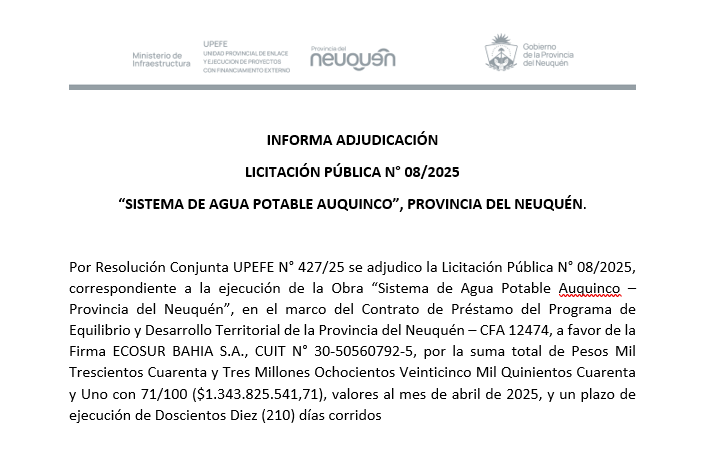 LICITACIÓN PÚBLICA N° 08/2025 – OBRA: “SISTEMA DE AGUA POTABLE AUQUINCO”, PROVINCIA DEL NEUQUÉN, EN EL MARCO CONTRATO DE PRÉSTAMO DEL PROGRAMA DE EQUILIBRIO Y DESARROLLO TERRITORIAL DE LA PROVINCIA DEL NEUQUÉN- CFA 12474