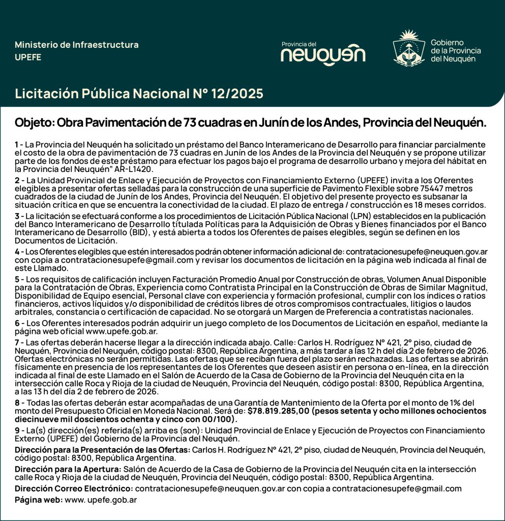 22 Dic 2025Licitaciones LICITACIÓN PÚBLICA NACIONAL N° 12/2025 – OBRA: «PAVIMENTACIÓN DE 73 CUADRAS EN JUNÍN DE LOS ANDES” PROVINCIA DEL NEUQUÉN, PROGRAMA DE DESARROLLO URBANO Y MEJORA DEL HÁBITAT EN LA PROVINCIA DEL NEUQUÉN (AR-L1420 BID) PLIEGO LICITATORIO LPN 12-2025