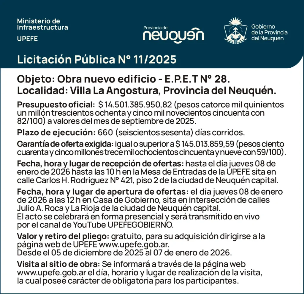 05 Dic 2025Licitaciones OBRA: “NUEVO EDIFICIO – E.P.E.T N.º 28 DE LA LOCALIDAD DE VILLA LA ANGOSTURA – PROVINCIA DEL NEUQUEN” LINK ACCESO PLIEGO LICITATORIO EPET 28 VILLA LA ANGOSTURA IF-2025-03786937-NEU-ADM#UPEFE VISITA DE OBRA EPET 28 VLADescarga