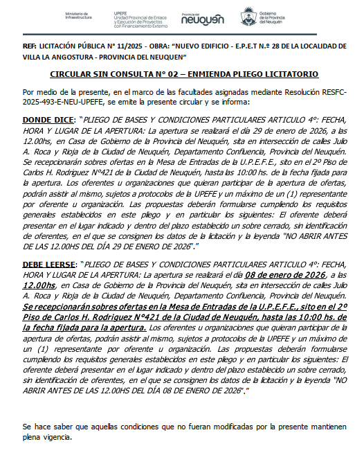 05 Dic 2025Licitaciones LICITACIÓN PÚBLICA N° 11/2025 – OBRA: “NUEVO EDIFICIO – E.P.E.T N.º 28 DE LA LOCALIDAD DE VILLA LA ANGOSTURA – PROVINCIA DEL NEUQUEN” LINK ACCESO PLIEGO LICITATORIO EPET 28 VILLA LA ANGOSTURA IF-2025-03786937-NEU-ADM#UPEFE VISITA DE OBRA EPET 28 VLADescarga IF-2025-03840370-NEU-ADM#UPEFE CIRCULAR CON CONSULTA 1Descarga IF-2025-03955651-NEU-ADM%UPEFEDescarga IF-2025-03969528-NEU-ADM#UPEFE CIRCULAR PRÓRROGADescarga Circular sin consulta n° 02 CIRCULAR CON CONSULTA 3Descarga LINK APERTURA EN VIVO 12HS IF-2026-00057795-NEU-ADM%UPEFEDescarga